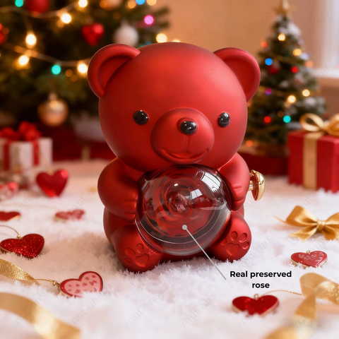 On the outside, a cute teddy bear. On the inside, a rose and a necklace that symbolize love, care, and commitment.